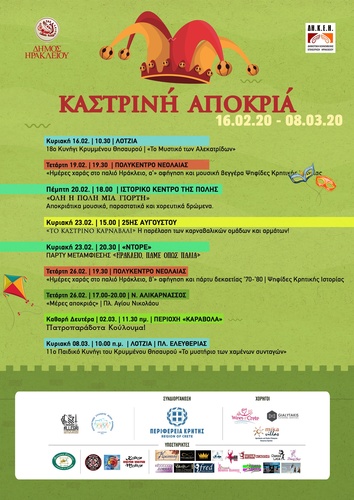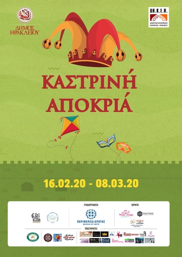 Με τραγούδι, χορό, εντυπωσιακά δρώμενα, πάρτι, ενδιαφέρουσες αφηγήσεις, παιγνίδια ο Δήμος Ηρακλείου, με την Κοινωφελή Δημοτική Επιχείρηση Πολιτισμού, Περιβάλλοντος και Κοινωνικής Πρόνοιας Ηρακλείου (ΔΗΚΕΗ), τη συμβολή της Περιφέρειας Κρήτης/ Π.Ε. Ηρακλείου, μαζί και την Ομάδα Εθελοντών Πολιτισμού του Δήμου διοργανώνουν την «Καστρινή Αποκριά 2020». Το φετινό πλούσιο αποκριάτικο πρόγραμμα αναλυτικά είναι: