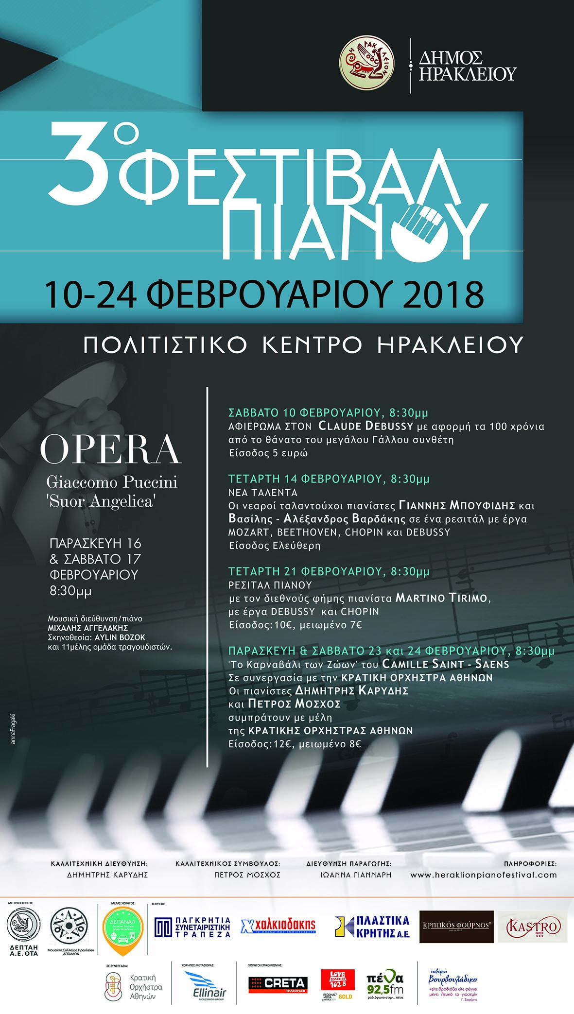 Εφέτος, το τρίτο Φεστιβάλ Πιάνου, με την συμμετοχή σπουδαίων μουσικών, νέων ταλέντων από την Κρήτη, με την εμφάνιση της Κρατικής Ορχήστρας Αθηνών, και με την παρουσίαση της Όπερας του Giacomo Puccini «Suor Angelica», διαθέτει όλες τις προϋποθέσεις να καταστεί πολιτιστικό γεγονός υψηλού επιπέδου.