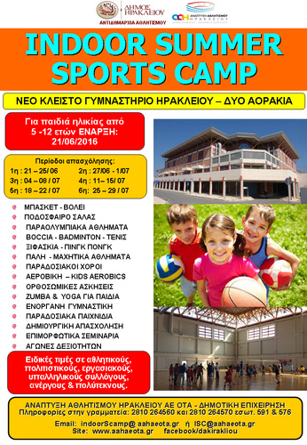 Το ¨INDOOR SUMMER SPORTS CAMP¨ αποτελεί μια καινοτόμα αθλητικο-πολιτιστική πρόταση στην πολύπλευρη ενασχόληση των παιδιών δημοτικού, η οποία συνδυάζει την φυσική δραστηριότητα και τον αθλητισμό με πολλά διαφορετικά καλλιτεχνικά και πολιτιστικά στοιχεία και δράσεις.