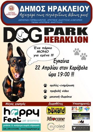 Εγκαινιάζεται την Κυριακή 22 Απριλίου και ώρα 19:00 στον Καράβολα το πρώτο πάρκο συγκέντρωσης κατοικίδιων σκύλων (Dogpark). H εκδήλωση θα περιλαμβάνει ομιλίες και ενημέρωση για την προαγωγή της φιλοζωίας, προβολή βίντεο κ.α