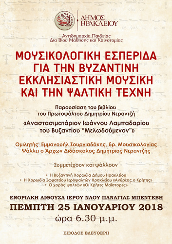 Μουσικολογική Εσπερίδα για τη Βυζαντινή Μουσική και την Ψαλτική Τέχνη  διοργανώνει η Αντιδημαρχία Παιδείας του Δήμου Ηρακλείου την Πέμπτη, 25 Ιανουαρίου 2018 και ώρα 18:30, στην ενοριακή αίθουσα Ιερού Ναού Γενεσίου της Θεοτόκου Μπεντεβή.