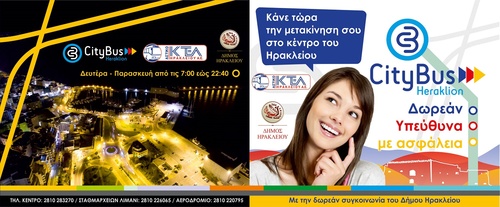 Υπεγράφη σήμερα, Δευτέρα 12 Φεβρουαρίου 2018 στη Λότζια, η σύμβαση για την «Παροχή υπηρεσιών συγκοινωνιακού έργου» ανάμεσα στον Δήμο Ηρακλείου και το ΚΤΕΛ  Αστικών Γραμμών Ηρακλείου ΑΕ. Η σύμβαση αυτή περιλαμβάνει την λειτουργία των δύο αστικών λεωφορειακών γραμμών «city bus» με τέσσερα λεωφορεία. Το επιβατικό κοινό της πόλης του Ηρακλείου  έχει τη δυνατότητα να χρησιμοποιεί τα λεωφορεία αυτά δωρεάν για την μετακίνηση του μέσα στην πόλη.
