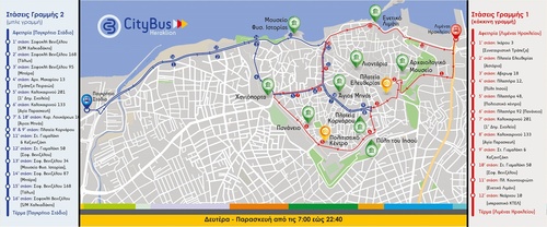 Τα δρομολόγια αυτά εκτελούνται καθημερινά από τις 07:00 το πρωί μέχρι τις 23:00 τη νύχτα και κάθε Σάββατο από τις 08:00 έως τις 16:00 μετά το μεσημέρι. Δεν θα εκτελούνται δρομολόγια κατά τις ημέρες των επίσημων αργιών. Οι χρήστες των city bus έχουν την δυνατότητα τη δωρεάν στάθμευσης στις αφετηρίες των δύο γραμμών.  Για την εξυπηρέτηση και την διευκόλυνση του επιβατικού κοινού διανέμεται και σχετικό φυλλάδιο με όλες τις απαιτούμενες πληροφορίες από τον Δήμο Ηρακλείου.