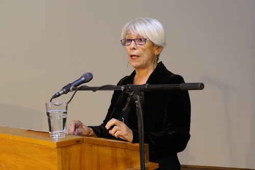 Στην εξαιρετική ομιλία της, η βραβευθείσα μίλησε για την βαθιά αγάπη της για το Ηράκλειο, για τη σχέση της πόλης με τα γράμματα, καθώς και για ένα ιδιαίτερο είδος λόγιου, τον Ηρακλειώτη λόγιο, όπως τον αποκάλεσε: «Φίλος, εκ των Αθηναίων και με μεγάλη εποπτεία του ελληνικού χώρου, με εντυπωσίασε προ καιρού εκφέροντας την φράση “αυτό το ειδικό είδος λογίου που είναι ο Ηρακλειώτης λόγιος”. Αναρωτήθηκα για το περιεχόμενο αυτής της φράσης αλλά δεν είχα χρόνο να τον ρωτήσω τότε άμεσα. Ύστερα προτίμησα να μην τον ρωτήσω. Με την ευκαιρία που μου δίδεται τώρα, θα ήθελα να κάνω μια προσπάθεια να εξιχνιάσω το περιεχόμενό της, καθώς με το πρώτο άκουσμα της φράσης αναγνώρισα ότι επρόκειτο για μιαν οφθαλμοφανή αλήθεια: σαν αστραπή πέρασε από μπροστά μου πλειάδα προσώπων και φυσιογνωμιών. Η σχέση της πόλης μας με τα γράμματα με είχε απασχολήσει από τα παιδικά μου χρόνια, καθώς τότε για πρώτη φορά, έχοντας φύγει μακριά από την πόλη, συναντούσα και γινόμουν αποδέκτης της αχλής του ηρακλειώτη λόγιου της διασποράς. Αυτό είναι κάτι που το προσλαμβάνεις ζώντας αλλού, όχι μέσα στην ίδια την πόλη. Το ότι υπάρχει αυτό το είδος, με αυτό το τοπικό χαρακτηριστικό αλλά χωρίς εντοπιότητα, μόνο σε χώρους μετοίκησης μπορείς να το συνειδητοποιήσεις. Χαρακτηριστικά: προοδευτικότητα, ανοιχτοσύνη, ψυχικό έρεισμα, αφοβία απέναντι στον μόχθο. ΄Eνα αίσθημα εγγύησης πλανιόταν γύρω από την ηρακλειώτικη μετοικεσία. Αυτό ενσωμάτωσα κι εγώ σαν παρακαταθήκη που την είχα στοιχειοθετήσει μόνη μου στα πρώτα αθηναϊκά μου χρόνια. Και στα μεγαλύτερα, επανερχόμενη εδώ, συναντούσα έναν κυοφορούμενο δυναμισμό, μια εργατικότητα, και ένα πολλαπλασιαστικό πνεύμα ομοφροσύνης. Πόσοι φίλοι εκ των Αθηναίων δεν ένιωθαν την έλξη του Ηρακλείου; Και τι πιο φυσικό, γιατί το έργο ασκεί μαγνητισμό και οι κεραίες τους τον έπιαναν.