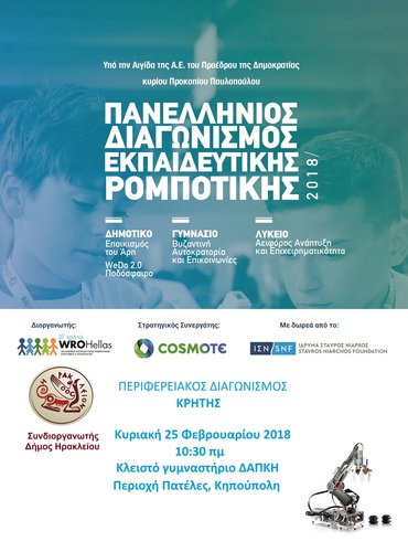 Ο Δήμος Ηρακλείου και ο Ελληνικός Οργανισμός Εκπαιδευτικής Ρομποτικής διοργανώνουν τον περιφερειακό διαγωνισμό Εκπαιδευτικής Ρομποτικής. Ο διαγωνισμός θα πραγματοποιηθεί την Κυριακή στις 25 Φεβρουαρίου 2018 και ώρα 10:30, στο κλειστό γυμναστήριο ΔΑΠΚΗ (περιοχή Πατελών). Στον διαγωνισμό υπάρχουν τρείς κατηγορίες στις οποίες και συμμετέχουν οι μαθητές των σχολείων της Κρήτης που δήλωσαν συμμετοχή.