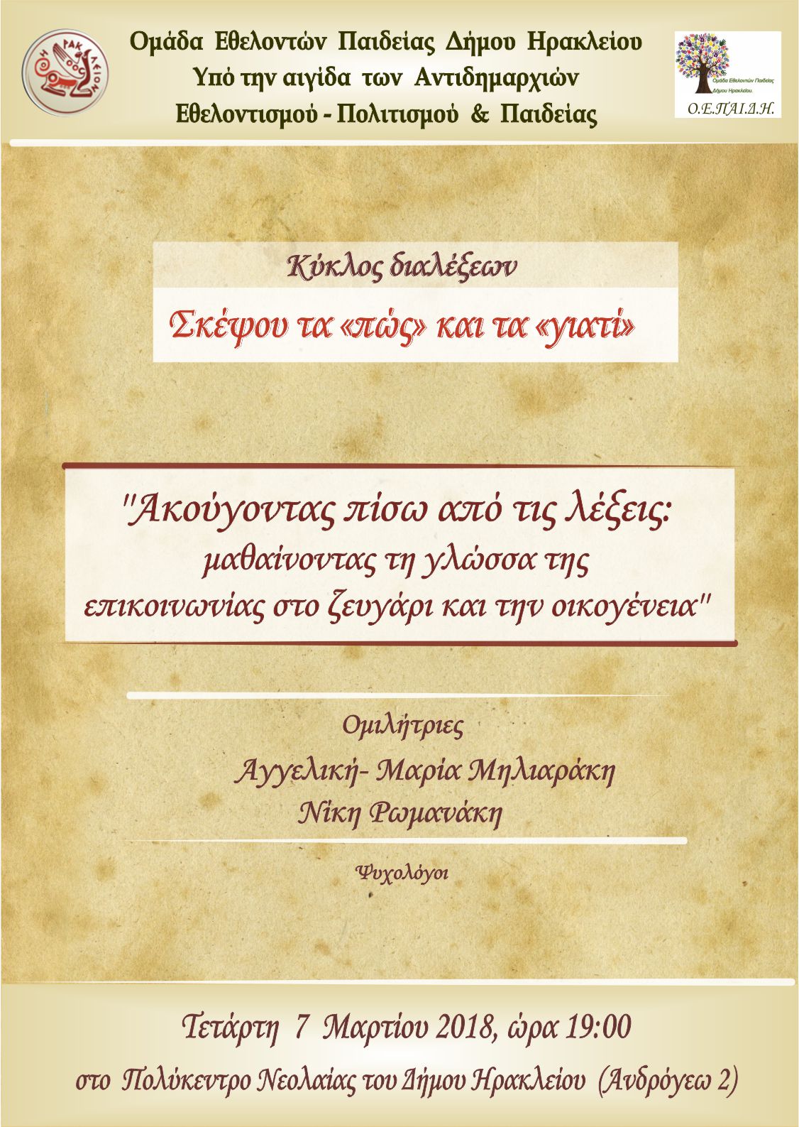Κύκλο διαλέξεων με τίτλο: Σκέψου τα « πώς» και τα «γιατί» διοργανώνει η Ομάδα Εθελοντών Παιδείας του Δήμου Ηρακλείου υπό την αιγίδα των Αντιδημαρχιών Παιδείας, Πολιτισμού - Εθελοντισμού. Στο πλαίσιο των διαλέξεων ειδικευμένοι επιστήμονες αναπτύσσουν θέματα που αφορούν στη διαχείριση ανθρώπινων σχέσεων και την αποτελεσματική επικοινωνία.