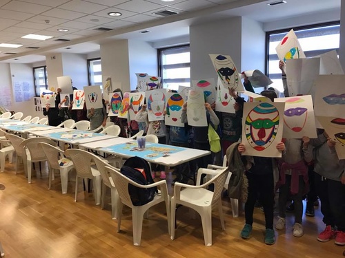 Στις δράσεις του Φεβρουαρίου, τα παιδιά, με τη βοήθεια της συντονίστριας του προγράμματος εξερεύνησαν τις μάσκες σε διάφορους πολιτισμούς. Έλαβαν μέρος δεκάδες δημοτικά σχολεία και περισσότεροι από 700 μαθητές ενώ, για τις ανάγκες της δράσης, φτιάχτηκαν 600 πρότυπα από πρωτόγονες βενετσιάνικες μάσκες και μάσκες θεάτρου.