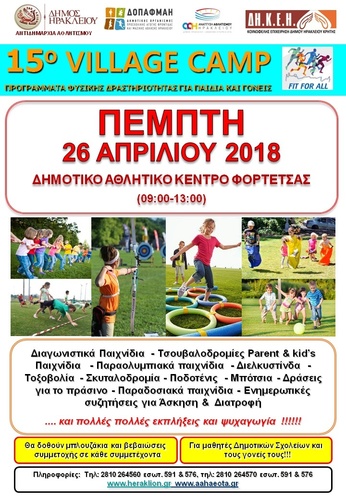Στο Δημοτικό Αθλητικό Κέντρο Φορτέτσας θα πραγματοποιηθεί την Πέμπτη 26 Απριλίου, από τις 09.00 έως τις 13.00,  το 15ο Village Camp του Δήμου Ηρακλείου.