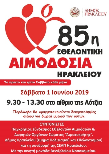 Εθελοντική Αιμοδοσία θα πραγματοποιηθεί το Σάββατο 01.06.2019 στο κέντρο της πόλης του Ηρακλείου (στο Αίθριο της Λότζια), και ώρες 10:00 – 13:30. Πρόκειται για μια κοινή προσπάθεια αιμοδοσίας, την οποία συντονίζουν: