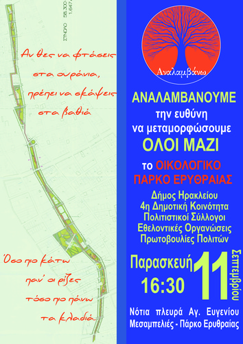 Η δράση αυτή  θα πραγματοποιηθεί αύριο  Παρασκευή 11 Σεπτεμβρίου στις 16:30  σε συνεργασία με τη 4η Δημοτική Κοινότητα, Πολιτιστικούς Σύλλογους Εθελοντικές Οργανώσεις, Πρωτοβουλίες Πολιτών οι οποίοι  θα προχωρήσουν στον καθαρισμό της νότιας πλευράς του Αγίου Ευγενίου, στο πάρκο Ερυθραίας.