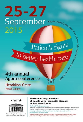 Ο Σύλλογος Ρευματοπαθών Κρήτης, ως ιδρυτικό μέλος της AGORA* (από το 2008) καθώς και μέλος του διοικητικού συμβουλίου της, έχει την εξαιρετική τιμή να διοργανώνει το ετήσιο συνέδριο της AGORA για το 2015. Το συνέδριο θα πραγματοποιηθεί στις 24-27 Σεπτεμβρίου 2015 στο Ηράκλειο, στο ξενοδοχείο GALAXY και για φέτος έχει τον τίτλο «Patients’ Rights to Better Health Care: Highlighting the different approaches for treating RMDs» («Τα δικαιώματα των ασθενών για καλύτερη περίθαλψη: υπογραμμίζοντας τις διαφορετικές προσεγγίσεις στην θεραπεία των ρευματικών νοσημάτων»). Το συνέδριο παρουσιάζει εξαιρετικό ενδιαφέρον καθώς συμμετέχουν Σύλλογοι ασθενών της νοτίου Ευρώπης, που αντιμετωπίζουν κοινά προβλήματα και ανάλογες προκλήσεις εξαιτίας της οικονομικής κρίσης και της συνεχιζόμενης ύφεσης.