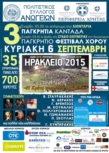 Με τη συνδιοργάνωση της Περιφέρειας Κρήτης και φορέων ο Πολιτιστικός Σύλλογος Ανωγείων πραγματοποιεί στο Ηράκλειο την Κυριακή 6 Σεπτεμβρίου 2015, την 3η Παγκρήτια Καντάδα (ώρα 17:00 στα Λιοντάρια) και το Παγκρήτιο Φεστιβάλ Χορού (ώρα 21:30 στο Στάδιο Ελευθερίας ) με συμμετοχή Πολιτιστικών Συλλόγων, Χορευτικών Ομίλων και Κρητικών Σχολών Χορού.