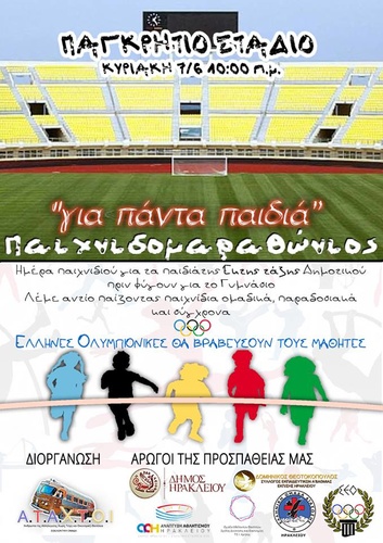 Το Εθελοντικό μας Σωματείο Α.Τ.Α.Χ.Τ.Ο.Ι(Άνθρωποι Της Αλληλεγγύης Χωρίς Τείχη & Οικονομική Ιδιοτέλεια) με ιδιαίτερη χαρά σας προσκαλεί να συμμετάσχετε στην διεξαγωγή των Πρώτων Αθλητικών αγώνων & παιχνιδιών με τίτλο «Για Πάντα Παιδιά - Παιχνιδομαραθώνιος »που θα πραγματοποιηθεί στις 7 Ιούνη στο Παγκρήτιο Στάδιο.