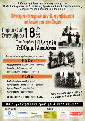 Με τη συνδιοργάνωση της Περιφερειακής Ενότητας Ηρακλείου θα πραγματοποιηθεί παραδοσιακή εκδήλωση με τίτλο «Πάτημα σταφυλιών & Αναβίωση παλιών παιχνιδιών» την Παρασκευή 18 Σεπτεμβρίου και ώρα 19.00 στην πλατεία Ατσαλένιου. Πρόκειται για μια διοργάνωση του Ομίλου Βρακοφόρων Νέας Γενιάς σε συνεργασία με την 4η Δημοτική Κοινότητα Ηρακλείου. Είσοδος ελεύθερη.