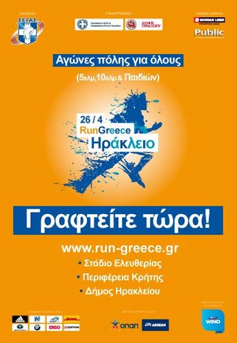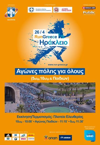 Με εντατικό ρυθμό συνεχίζονται η προετοιμασία και οι εγγραφές για τη συμμετοχή στη μεγάλη γιορτή του αθλητισμού και πολιτισμού, με την ονομασία «RUN GREECE ΗΡΑΚΛΕΙΟ», που διοργανώνουν για τρίτη χρονιά στο Ηράκλειο, ο Σ.Ε.Γ.Α.Σ., η Περιφέρεια Κρήτης – Περιφερειακή Ενότητα Ηρακλείου, ο Δήμος Ηρακλείου και η Ε.Α.Σ. Σ.Ε.Γ.Α.Σ. Κρήτης, την Κυριακή 26 Απριλίου.