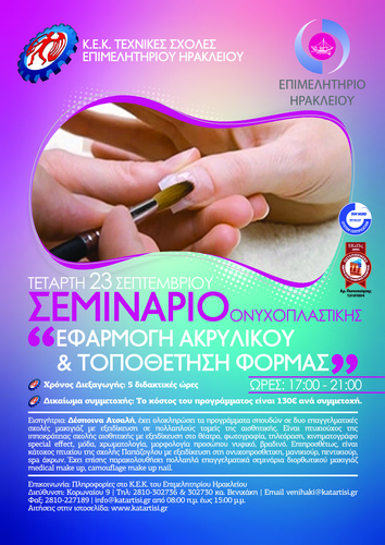 Το ΚΕΚ ΤΕΧΝΙΚΕΣ ΣΧΟΛΕΣ ΕΠΙΜΕΛΗΤΗΡΙΟΥ ΗΡΑΚΛΕΙΟΥ διοργανώνει σεμινάριο ονυχοπλαστικής με θέμα «Εφαρμογή Ακρυλικού και Τοποθέτηση Φόρμας» το οποίο απευθύνεται σε επαγγελματίες του χώρου, αλλά και σε όσους θέλουν να γνωρίσουν την εφαρμογή ακρυλικού και την τοποθέτηση φόρμας σε νύχια.