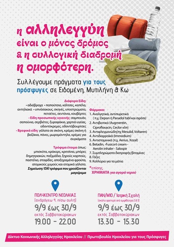 Μέχρι την Τετάρτη 30 Σεπτεμβρίου και ώρες 19:00 – 22:00, εκτός Σαββάτου και Κυριακής, στην πίσω αυλή του Πολύκεντρου Νεολαίας του Δήμου Ηρακλείου, στην οδό Ανδρόγεω, δίπλα στο Κ.Ε.Π., πίσω από τη Βασιλική του Αγίου Μάρκου, συγκεντρώνουμε και πάλι είδη ανάγκης για τους πρόσφυγες σε Ειδομένη, Μυτιλήνη και Κω.