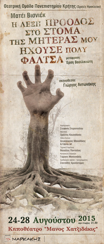 Η θεατρική ομάδα των φοιτητών του Πανεπιστημίου Κρήτης (Σχολές Ηρακλείου) συνεχίζει με επιτυχία τις παραστάσεις του έργου «Η λέξη πρόοδος στο στόμα της μητέρας μου ηχούσε πολύ φάλτσα» στο κοινό του Ηρακλείου έως και την Παρασκευή 28 Αυγούστου στο Κηποθέατρο «Μ. Χατζιδάκις» στις 21:30. Το βραβευμένο — στο Φεστιβάλ της Avinion το 2004 — έργο του Ρουμάνου Φιλέλληνα συγγραφέα Ματέϊ Βισνιέκ σκηνοθετεί ο Γιώργος Αντωνάκης σε μετάφραση της Έρσης Βασιλικιώτη.