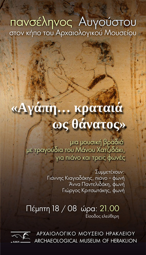 Το Αρχαιολογικό Μουσείο Ηρακλείου σας προσκαλεί στη συναυλία που θα διεξαχθεί στον κήπο του μουσείου, τη βραδιά της πανσελήνου, 18 Αυγούστου 2016, στις 21:00.