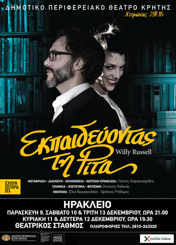 Το Δημοτικό Περιφερειακό Θέατρο Κρήτης παρουσιάζει στο Ηράκλειο στην αίθουσα του Θεατρικού Σταθμού το έργο «Εκπαιδεύοντας τη Ρίτα» του Willy Russell, σύμφωνα με το ακόλουθο πρόγραμμα παραστάσεων: