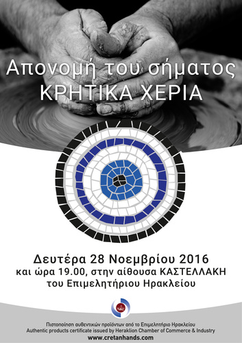 - 19.45-20.00 Απονομή των πιστοποιήσεων ΚΡΗΤΙΚΑ ΧΕΡΙΑ στους δικαιούχους από τον Περιφερειάρχη Κρήτης κ. Σταύρο