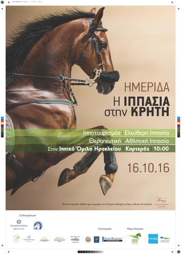 Η Περιφέρεια Κρήτης και η Ελληνική Ομοσπονδία Ιππασίας συνδιοργανώνουν ημερίδα με θέμα «Η Ιππασία στην Κρήτη», με την υποστήριξη των Δήμων Ηρακλείου, Ρεθύμνης, και Αγ. Βασιλείου η οποία θα φιλοξενηθεί στις εγκαταστάσεις του Ιππικού Ομίλου Ηρακλείου στον Καρτερό, την Κυριακή 16 Οκτωβρίου 2016.