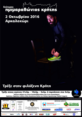 Με την συνδιοργάνωση της Περιφέρειας Κρήτης θα πραγματοποιηθεί ο 2ος Ημιμαραθώνιος Κρήτης ( 21,1 χιλ) που οργανώνει ο Αθλητικός Σύλλογος Υγείας ΑΘΛΗ.Σ.Υ στο Αρκαλοχώρι . Παράλληλα θα διεξαχθούν αγώνες δρόμου 5 και 10 χιλιομέτρων και αγώνας 1000 μέτρων  για παιδιά Δημοτικού  με την ονομασία «Arkalochori Street Run». Όλοι οι αγώνες θα διεξαχθούν την Κυριακή 2 Οκτωβρίου 2016  στο Αρκαλοχώρι, εκκίνηση-τερματισμός δημοτικό θέατρο Αρκαλοχωρίου και συγκεκριμένα: 10 Χιλιόμετρα : 09:00, Ημιμαραθώνιος : 09:15, 1000 μέτρα : 09:20, 5 χιλιόμετρα 12:00.