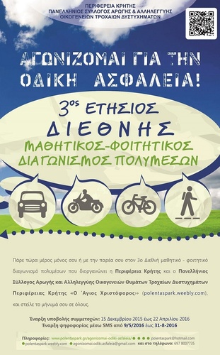 Με την συνδιοργάνωση της Περιφέρειας Κρήτης, του "Πανελλήνιου Συλλόγου Αρωγής και Αλληλεγγύης Οικογενειών Θυμάτων Τροχαίων Δυστηχημάτων - Ο Άγιος Χριστόφορος" και την υποστήριξη του Πολυτεχνείου Κρήτης, του Πανεπιστημίου Κρήτης, του ΤΕΙ Κρήτης και της Περιφερειακής Διεύθυνσης Πρωτοβάθμιας και Δευτεροβάθμιας Εκπαίδευσης Κρήτης προκηρύσσεται ο 3ος Διεθνής Μαθητικός Φοιτητικός Διαγωνισμός Πολυμέσων Video Clip, ηχητικού μηνύματος, αφίσας, με τίτλο «Αγωνίζομαι για την οδική ασφάλεια"-Ας συμβάλλουμε όλοι για να χάσουμε την πρωτιά .... στα τροχαία δυστυχήματα». Σήμερα στο πλαίσιο συνέντευξης τύπου στην Περιφέρεια Κρήτης έγιναν γνωστές οι λεπτομέρειες του διαγωνισμού που στοχεύει στην ενημέρωση-πρόληψη κυρίως των νέων ανθρώπων στους τομείς οδηγικής συμπεριφοράς και οδικής ασφάλειας.