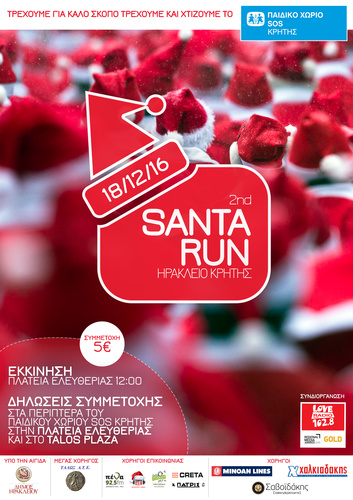 Όλα είναι έτοιμα για τον εορταστικό αγώνα santa run 2016 που θα πραγματοποιηθεί την Κυριακή 18 Δεκεμβρίου 2016 στο Ηράκλειο, με στόχο την ενίσχυση του Παιδικού Χωριού SOS Κρήτης. Οι αιτήσεις συμμετοχής γίνονται στην Πλατεία Ελευθερίας και στο TALOS PLAZA.
