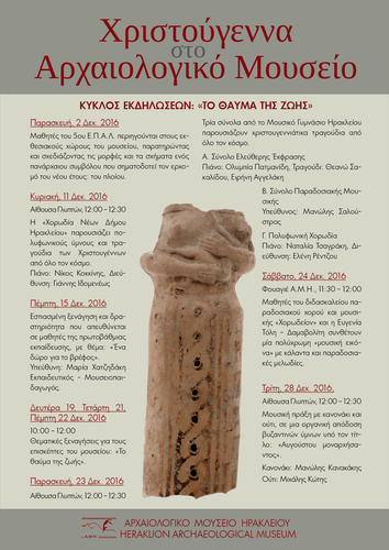 Το Αρχαιολογικό Μουσείο Ηρακλείου σας προσκαλεί στις εκδηλώσεις που θα λάβουν χώρα στους χώρους του κατά τη διάρκεια των χαρμόσυνων ημερών που σηματοδοτούν τη γέννηση του Χριστού και την έλευση του νέου έτους. Οι φετινές εκδηλώσεις περιστρέφονται γύρω από τη θεματική με τίτλο «Το θαύμα της ζωής». Μέσα από τις υλικές μαρτυρίες του παρελθόντος αναδεικνύονται οι αντιλήψεις και οι εκφράσεις των ανθρώπων για το μυστήριο της γέννησης, για το θαύμα της ζωής.