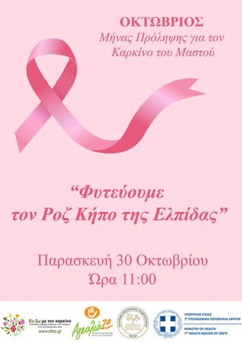 Όλοι μαζί, φυτεύουμε το παρτέρι στον προαύλιο χώρο της 7ης Υ.ΠΕ. Κρήτης με φυτά ροζ χρώματος, όπως τριανταφυλλιές, γεράνια ή γκάουρα, κ.α.. Κάθε φυτό θα φέρει σε ειδική σήμανση το όνομα του δωρητή.