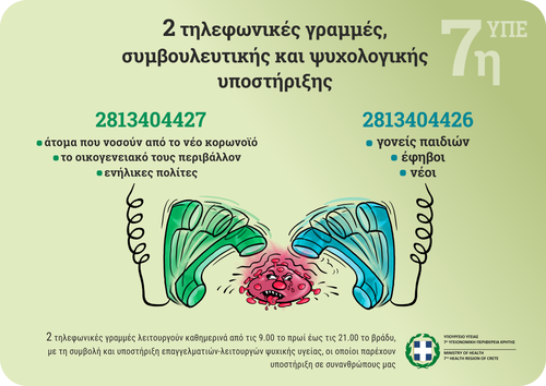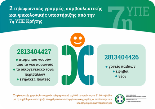 Τρίτη εβδομάδα λειτουργίας των τηλεφωνικών γραμμών συμβουλευτικής και ψυχολογικής υποστήριξης, τις οποίες έχει θέσει η 7η Υγειονομική Περιφέρεια Κρήτης στη διάθεση των πολιτών.