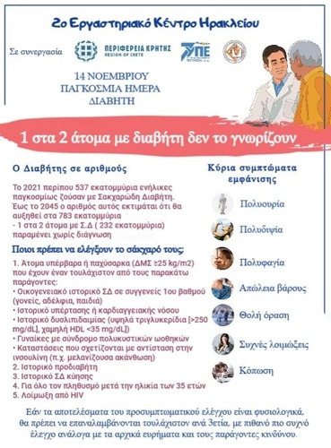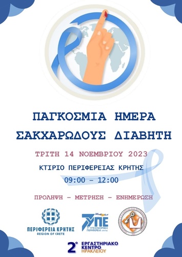 Στο πλαίσιο των δράσεων ευαισθητοποίησης και πρόληψης, με αφορμή την Παγκόσμια Ημέρα Διαβήτη, σήμερα Τρίτη 14 Νοεμβρίου 2023 από τις 9.00- 12.00 το μεσημέρι έξω από την Περιφέρεια Κρήτης θα παρέχετε σχετική ενημέρωση, συμβουλευτική και καθοδήγηση του κοινού και διανομή έντυπου υλικού με σκοπό την επαύξηση των γνώσεων σχετικά με τον διαβήτη.