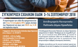 Ο Δήμος Ηρακλείου (Αντιδημαρχία Κοινωνικής Πολιτικής) προχωρά και για το σχολικό έτος 2018-2019, στη συγκέντρωση σχολικών ειδών (τσάντες-κασετίνες καινούργιες ή μεταχειρισμένες σε καλή κατάσταση, τετράδια, μολύβια, στυλό, γόμες κλπ.) με σκοπό να διατεθούν μέσω των Κοινωνικών Υπηρεσιών του Δήμου σε μαθητές των οποίων οι οικογένειές τους αντιμετωπίζουν οικονομικές δυσκολίες.