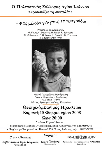 Οι κυρίες Κρητσωτάκη Ευαγγελία και Sadine Wurz παρουσιάζουν Έκθεση Χειροποίητης Τέχνης που θα φιλοξενηθεί από τις 26 Ιανουαρίου 2008 έως τις 5 Φεβρουαρίου 2008 στην Πύλη Αγίου Γεωργίου στην Πλατεία Ελευθερίας. Η έκθεση θα λειτουργεί καθημερινά από 8:00 έως 14:00 και 17:00 - 20:00.