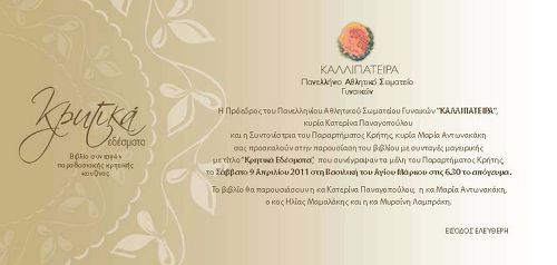 Το πανελλήνιο αθλητικό σωματείο γυναικών ΚΑΛΛΙΠΑΤΕΙΡΑ σας προσκαλεί στην παρουσίαση του βιβλίου συνταγών ΚΡΗΤΙΚΑ ΕΔΕΣΜΑΤΑ μια δημιουργία των μελών του με σκοπό την προώθηση και διάδοση της κρητικής παραδοσιακής κουζίνας.