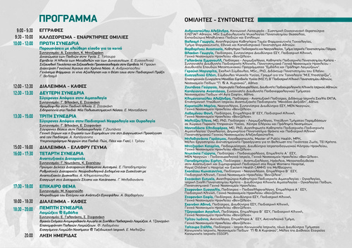 Πέντε εξέχοντες επαγγελματίες υγείας από όλη την Ελλάδα, θα αναπτύξουν θέματα κοινού παιδιατρικού ενδιαφέροντος, όπως τα Δικαιώματα του Παιδιού στην Υγεία, η Διαχείριση του Άγχους των Γονέων με Παιδί με Χρόνιο Νόσημα και τα Γενόσημα Φάρμακα.