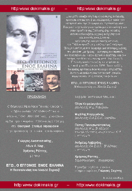 Ο δήµαρχος Ηρακλείου ΓΙΑΝΝΗΣ ΚΟΥΡΑΚΗΣ, το βιβλιοπωλείο ∆ΟΚΙΜΑΚΗ και οι ΕΚ∆ΟΣΕΙΣ ΚΑΣΤΑΝΙΩΤΗ σας προσκαλούν τη ∆ευτέρα 7 Απριλίου 2008 και ώρα 7.30 µ.µ. στο Θεατρικό Σταθµό Ηρακλείου, στην παρουσίαση του βιβλίου που έγραψαν οι ΓΙΩΡΓΟΣ ΑΝΑΣΤΑΣΙΑ∆ΗΣ, ΛΕΩΝ Α. ΝΑΡ, ΧΡΗΣΤΟΣ ΡΑΠΤΗΣ ΕΓΩ, Ο ΕΓΓΟΝΟΣ ΕΝΟΣ ΕΛΛΗΝΑ Η Θεσσαλονίκη του Νικολά Σαρκοζί.