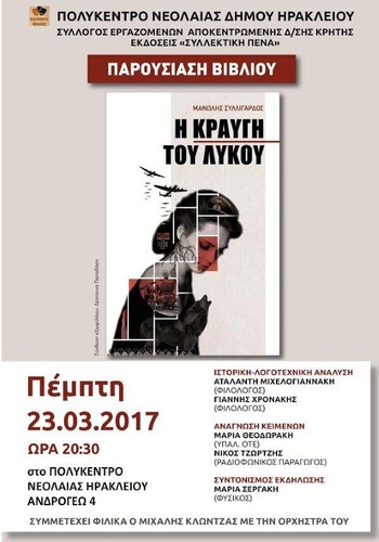 Το βιβλίο του Μ. Συλλιγάρδου, «Η ΚΡΑΥΓΗ ΤΟΥ ΛΥΚΟΥ» παρουσιάζεται στο Πολύκεντρο Νεολαίας του Δ.Η. την Πέμπτη 23 Μαρτίου και ώρα 20:30, με ελεύθερη είσοδο.