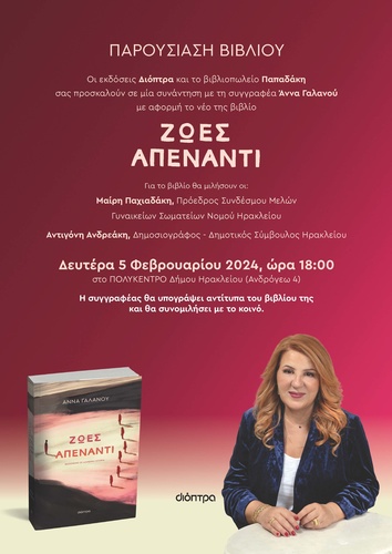Παρουσίαση του βιβλίου «Ζωές απέναντι» της Άννας Γαλανού τη Δευτέρα 5 Φεβρουαρίου 2024 και ώρα 18:00 στο ΠΟΛΥΚΕΝΤΡΟ του Δήμου Ηρακλείου (Ανδρόγεω 4).