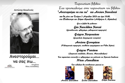 Σας προσκαλούμαι την Τετάρτη 3 Απριλίου 2024, στις 19:00, στο Πολύκεντρο του Δήμου Ηρακλείου (Ανδρόγεω 4), στην παρουσίαση του βιβλίου «Ανεστορούμαι να σας πω», του Αντώνη Κουκλινού.