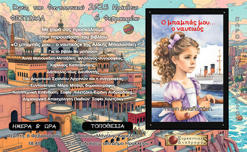 Παρουσίαση του βιβλίου «Ο μπαμπάς μου... ο ναυτικός» της Αλίκης Μπαλασάκη την Πέμπτη 6 Φεβρουαρίου 2025 στις 18:45 στην αίθουσα Μανόλης Καρέλλης στην Ανδρόγεω του Δήμου Ηρακλείου.