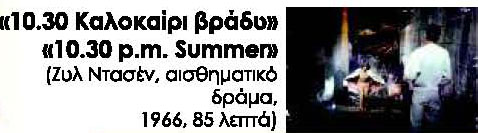 Προβολή της ταινίας "10.30 ΚΑΛΟΚΑΙΡΙ ΒΡΑΔΥ", "10.30 P.M. SUMMER",(Ζυλ Ντασέν,αισθηματικό δράμα, 1966, 85 λεπτά) Τετάρτη 23 και Πέμπτη 24 Ιουλίου στις 21:30.