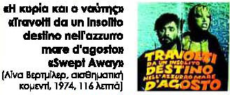 Προβολή της ταινίας "Η ΚΥΡΙΑ ΚΑΙ Ο ΝΑΥΤΗΣ" "SWEPT AWAY",(Λίνα Βερτμίλερ,αισθηματική κομεντί,1974, 116 λεπτά) Παρασκευή 22 και Σάββατο 23 Αυγούστου στις 21:30.