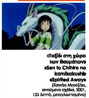 Προβολή της ταινίας "ΤΑΞΙΔΙ ΣΤΗ ΧΩΡΑ ΤΩΝ ΘΑΥΜΑΤΩΝ" "SEN TO CHIHIRO NO KAMIKAKUSHI" "SPIRITED AWAY"(Χαγιάο Μιγιαζάκι,κινούμενα σχέδια,2001, 125 λεπτά,μεταγλωττισμένο) Δευτέρα 11 και Τρίτη 12 Αυγούστου στις 21:30.