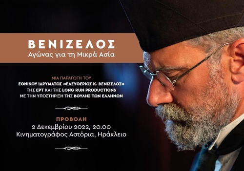 Το δραματοποιημένο ντοκιμαντέρ-συμπαραγωγή του Εθνικού Ιδρύματος Ερευνών και Μελετών «Ελευθέριος Κ. Βενιζέλος», της ΕΡΤ και της Long Run Productions, «ΒΕΝΙΖΕΛΟΣ, αγώνας για τη Μικρά Ασία» θα παρουσιαστεί την Παρασκευή 2 Δεκεμβρίου στις 20:00, στο κινηματοθέατρο ΑΣΤΟΡΙΑ στο Ηράκλειο. Η εκδήλωση διοργανώνεται από το Εθνικό Ίδρυμα «Ελευθέριος Κ. Βενιζέλος» και τη Long Run Productions, με την υποστήριξη της Περιφέρειας Κρήτης και του Δήμου Ηρακλείου.