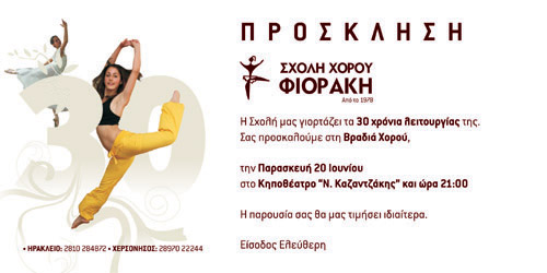 Την Παρασκευή 20 Ιουνίου 2008 στο Κηποθέατρο «Ν. Καζαντζάκης» Η Σχολή Χορού ΦΙΟΡΑΚΗ θα
