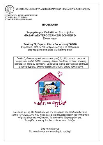 Το μεγάλο ΠΑΖΑΡΙ του Σεπτεμβρίου «ΠΑΖΑΡΙ ΔΕΥΤΕΡΟ ΧΕΡΙ-ΧΕΡΙ ΒΟΗΘΕΙΑΣ» του «ΞΕΝΩΝΑ ΓΙΑ ΤΗΝ ΚΑΚΟΠΟΙΗΜΕΝΗ ΓΥΝΑΙΚΑ ΚΑΙ ΤΟ ΠΑΙΔΙ» θα πραγματοποιηθεί την Τετάρτη 22, Πέμπτη 23 και Παρασκευή 24/9/10 στη Λότζια, από τις 10 το πρωί έως τις 6 το απόγευμα.