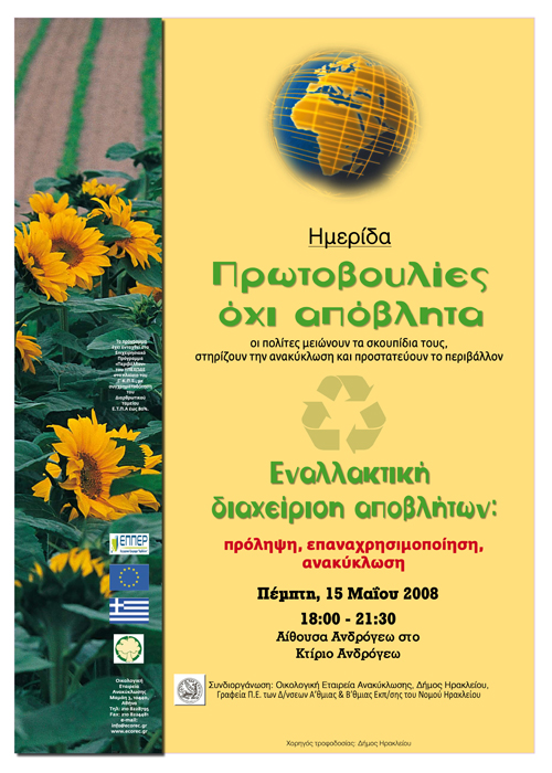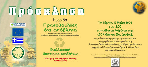 Η Οικολογική Εταιρεία Ανακύκλωσης σε συνεργασία με το Δήμο Ηρακλείου, τα Γραφεία Περιβαλλοντικής Εκπαίδευσης της Διεύθυνσης Πρωτοβάθμιας και Δευτεροβάθμιας Εκπαίδευσης, διοργανώνουν μια ημερίδα, με θέμα «ΠΡΩΤΟΒΟΥΛΙΕΣ, ΟΧΙ ΑΠΟΒΛΗΤΑ» την Πέμπτη 15 Μαΐου 2008 και ώρα 18:00 στο κτήριο «ΑΝΔΡΟΓΕΩ», στην αίθουσα «ΑΝΔΡΟΓΕΩ», στην οδό Ανδρόγεω.