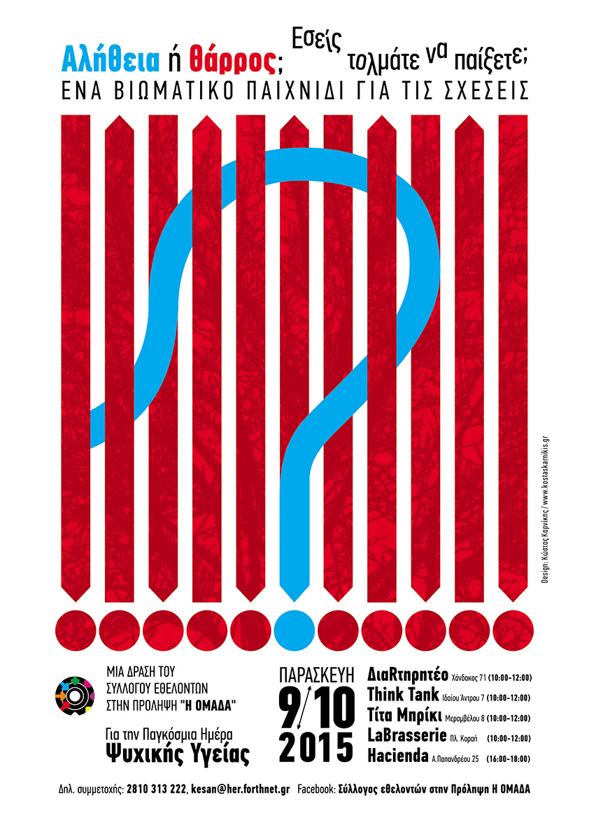 Ο Σύλλογος Εθελοντών στην Πρόληψη "Η Ομάδα", με αφορμή την Παγκόσμια Ημέρα Ψυχικής Υγείας, θα πραγματοποιήσει την Παρασκευή 9 Οκτωβρίου 2015 το βιωματικό παιχνίδι για τις σχέσεις "Αλήθεια ή θάρρος", σε καφετέριες της πόλης.